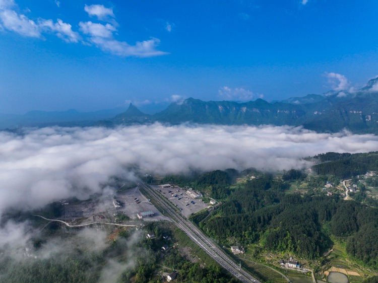 5月23日,重庆市南川区金佛山东麓云海景观和山间高速公路交织(无人机照片)。新华社记者 刘潺 摄