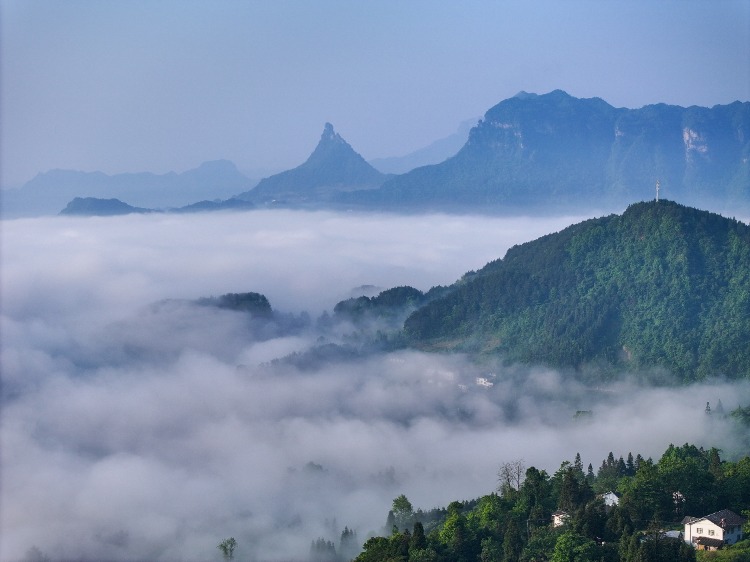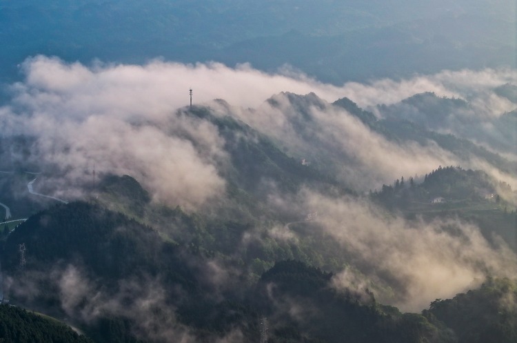 当日,位于重庆市南川区的世界自然遗产地金佛山雨后放晴,云海在山峦间流淌,美不胜收。